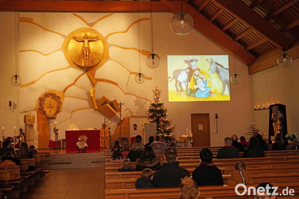 Pfarrer Norbert Götz freute sich, dass endlich Weihnachten ist und fragte die Kinder, warum sie sich denn so arg freuten: „Auch wegen den Geschenken“, klang es vorsichtig aus einer Kinderkehle, was den Geistlichen amüsierte. Kinder hatten im Vorfeld auch eine Vielzahl von Engel gemalt, die nun überall im Gotteshaus „ausgestellt“ waren.