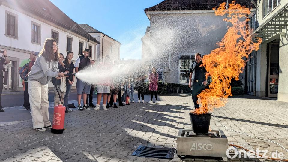 Am Folgetag lernten die künftigen "Guards" bei Eva Maria Bühler vom Bayerischen Roten Kreuz die Grundlagen der Ersten Hilfe bei Notfällen. Am Tag darauf ging es bei der Weidener Feuerwehr hoch hinaus. Krönung der Einweisung von Stadtbrandrat Richard Schieder und seinem Team in die Abläufe und Ausrüstung war eine Fahrt im Korb des Drehleiter-Fahrzeugs. Schließlich übten die Jugendlichen noch, wie man einen Brand mit dem Feuerlöscher bekämpft. Am vierten Tag ging es zum Bahnhof. Die Verkehrsgesellschaft "Agilis" hatte einen Zug bereitgestellt. Die Ausbildungs-Lokführer Bernd Wolfrum und Andreas Kasper erklärten die Notruf- und Kommunikationseinrichtungen.