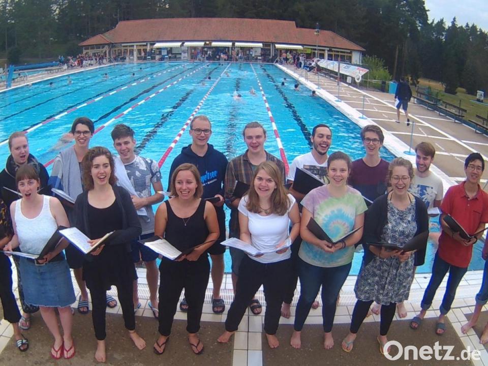 Nach einem kurzen Durchhänger bei leichtem Regen in den Mittagsstunden brachte der Schwimmverein-Nachwuchs wieder Leben in die Aktion. Den größten Ansturm erwarteten die Veranstalter aber in den Abendstunden. Denn nach Einbruch der Dunkelheit gingen die Lichter an. Es wurde mächtig getrommelt und der Würzburger Universitätschor sang mit 80 Leuten am Beckenrand, der inoffizielle Auftakt des Weidener Chorfests an diesem Wochenende. Nachher gab’s Rockmusik vom Band bis zum Weckruf Samstagfrüh mit Radio Ramasuri. Der normale Badebetrieb fand ungehindert statt.