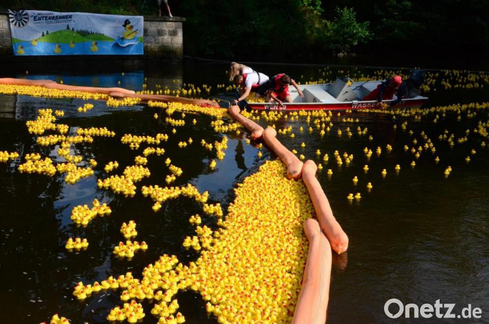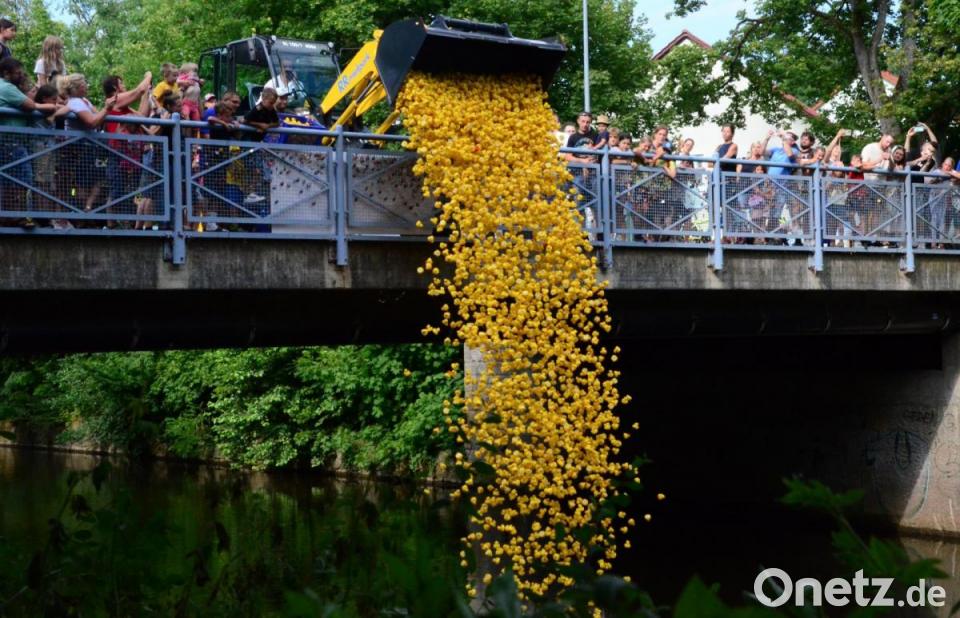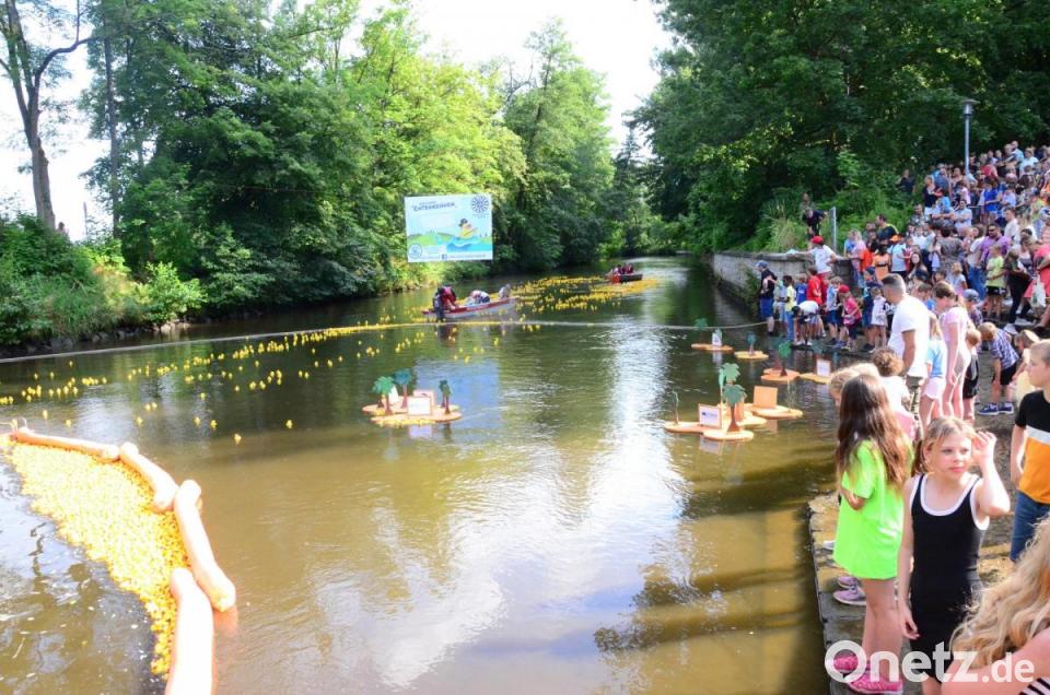 Punkt 17.30 Uhr, kurz vor Ende des Weidener Kinderbürgerfestes am Sonntag, kippte ein Lader 6000 Gummienten von der Brücke in den Flutkanal. Das traditionelle Entenrennen des Round Table Weiden war eröffnet. Nur wenige Minuten brauchten die Gummienten dann bis sie an der Max-Reger-Park-Arena ankamen, wo hunderte Besucher auf sie warteten.