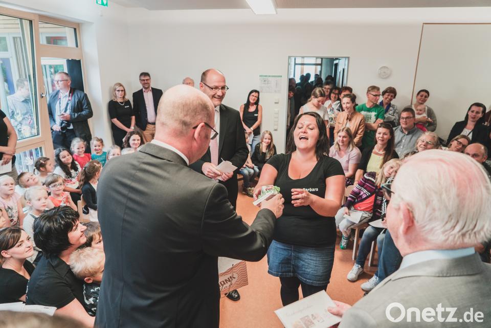 Happy war am Freitag auch die heimliche "Frau Bauaufsicht", wie Dekan Lukas Kindergartenleiterin Barbara Zehrer respektvoll nannte. Sie durfte zuvor von allen ein dickes Dankeschön für ihre Geduld und Standhaftigkeit entgegennehmen. Zehrer dankte vor allem ihrem Team, das inzwischen 18 Mitarbeiter zählt, fürs Durchhalten. Gemeinsam betreuen sie 125 Kinder (darunter 25 Hortkinder) in vier Gruppen. Der Frauenbund St. Konrad übergab zum Schluss als Überraschung noch eine Spende über 1000 Euro. Das Geld soll in die Gartengestaltung einfließen.