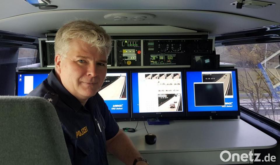 - An der Brücke steht ein Fahrzeug der VPI. Die Bilder der Kameras werden über Kabel auf vier Monitore im Auto übertragen und von einem Beamten beobachtet. Die Technik sortiert kritische Fälle vor.
