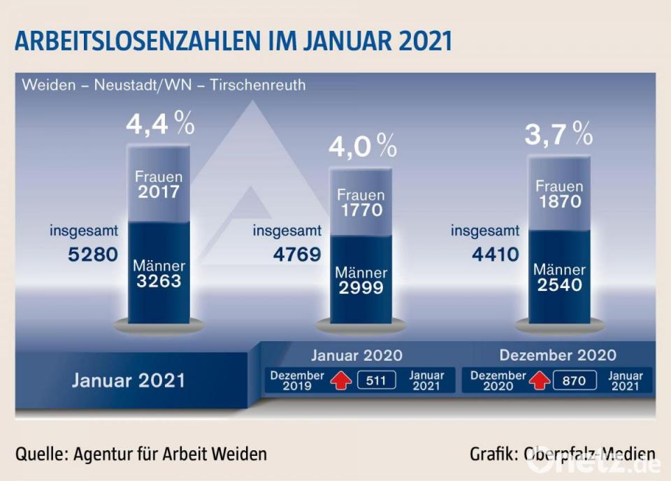 „Nicht nur die abgeschwächte konjunkturelle Lage aufgrund der anhaltenden Pandemie und dem aktuellen Lockdown, sondern auch die einsetzende winterliche Kälte lässt die Arbeitslosenquote steigen", erklärte Thomas Würdinger, Chef der Arbeitsagentur Weiden. Die Zahl der arbeitslosen Menschen habe sich vom Dezember auf Januar um 870 erhöht. "Diese Zunahme ist zwar saisonbedingt üblich, spielt sich aber hauptsächlich in der Arbeitslosenversicherung ab und fällt insgesamt höher aus als noch im vergangenen Jahr.“