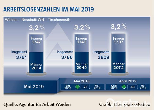 In der Stadt Weiden ist die Zahl der Erwerbslosen auf 1173 gesunken, gegenüber Mai 2018 ist dies eine Zunahme um 26. Die Arbeitslosenquote lag im Mai bei 4,9 Prozent (Verbesserung um 0,2 Prozent im Vergleich zum Vormonat). Im Mai war die Agentur für Arbeit Weiden für 466 arbeitslose Menschen im Stadtgebiet zuständig, und damit für 29 Arbeitslose weniger als im Vormonat. Das Jobcenter Weiden-Neustadt berichtet über einen Rückgang um 0,6 Prozent und ist für 707 Arbeitslose erster Ansprechpartner bei der Jobsuche.