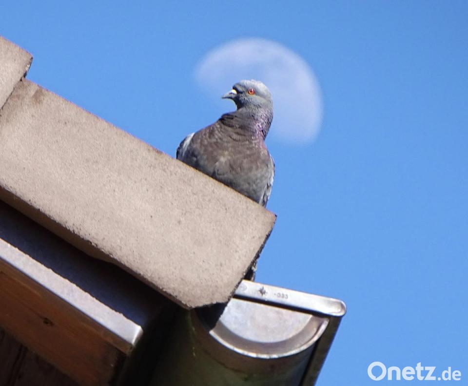 Weil der Mond auch am Tage beschienen wird, kann er auch dann am Himmel auftauchen. So wie neulich am Stockerhutweg. Wann und in welcher Form der Mond aber tagsüber sichtbar wird, hängt von den verschiedenen Mondphasen, also von der Position des Mondes zur Erde und der Sonne ab. Dabei umkreist der Mond die Erde innerhalb von 27,3 Tagen. Dabei eben kommt vor, dass der Mond tagsüber erscheint – und eine Taube, die am Stockerhutweg vor sich hingurrt, zu einer scheinheiligen Taube werden lässt.