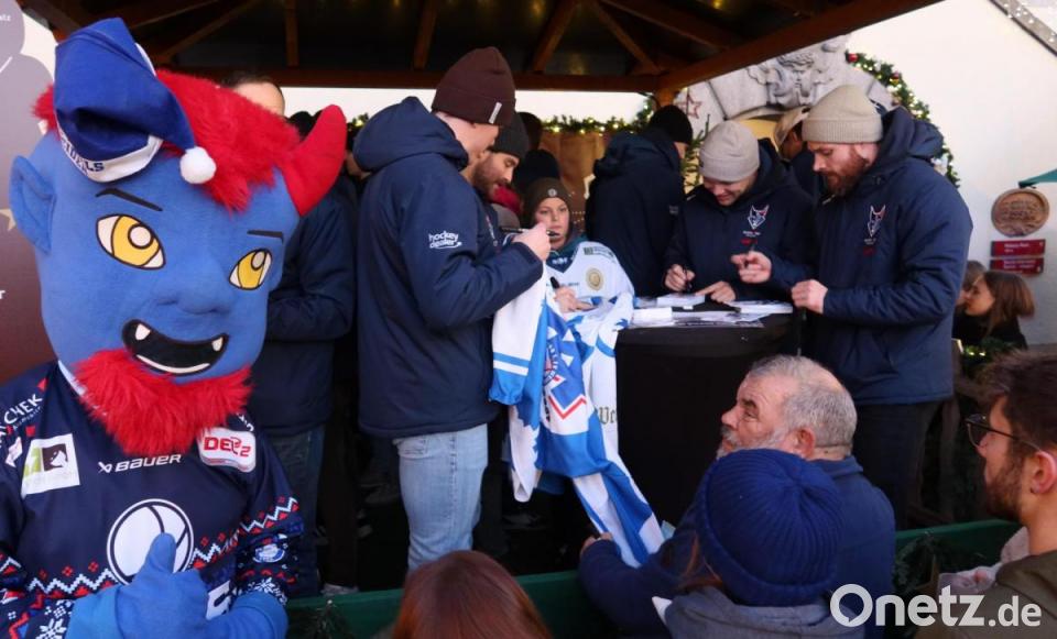 Mit einem 2:1-Heimsieg gegen den EV Landshut im Rücken fühlten sich die Blue Devils bei der Autogrammstunde auf dem Weidener Christkindlmarkt am Samstagnachmittag natürlich pudelwohl. Es sei ein toller Austausch mit den Fans, sagte der sportliche Leiter Jürgen Rumrich. "Die unterstützen uns im Stadion. Bei solchen Gelegenheiten kann man sich auch mal besser kennenlernen. Gestern der Sieg. Ein volles Haus. Was will man mehr."