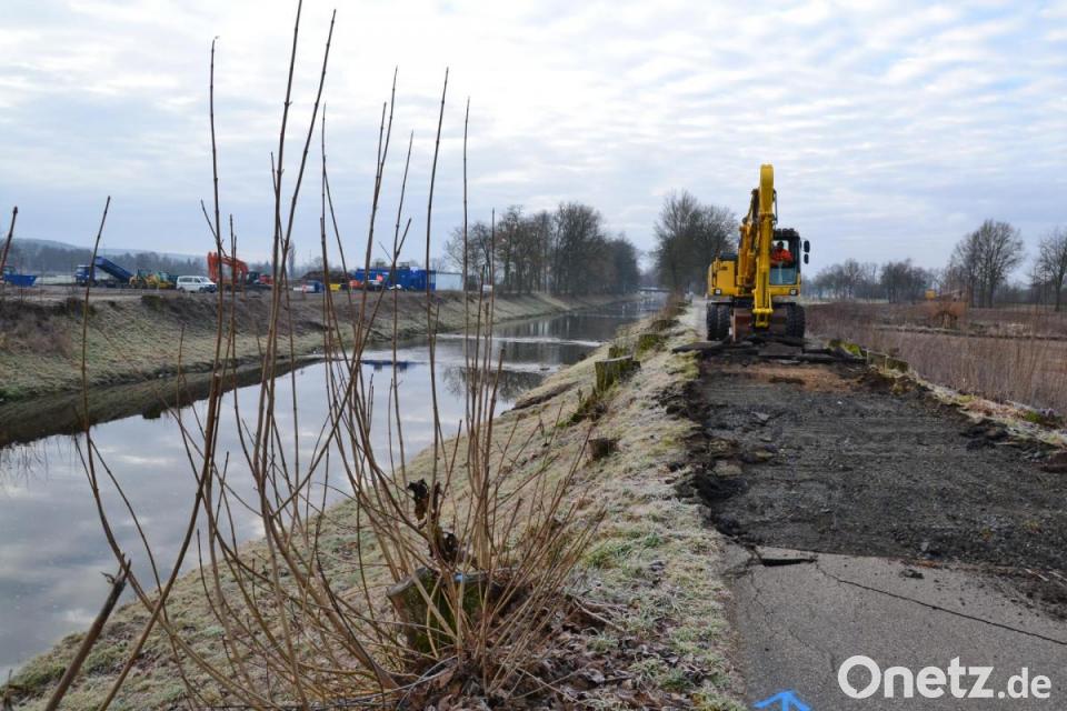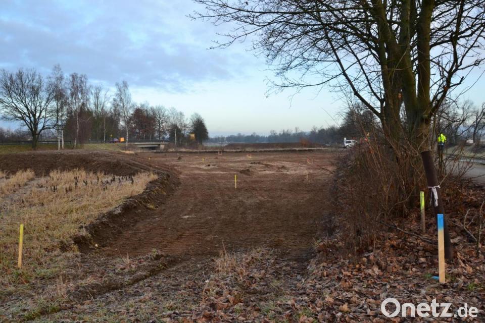 So ist bereits die Fläche für den Behelfsradweg und die Rinne für die Umleitung des Flutkanals ausgeschoben, der Verlauf mit Holzpfosten abgesteckt. Auf der gegenüberliegenden Schirmitzer Seite sind seit Dezember die Zufahrtsstraße für die Baufahrzeuge und der Materiallagerplatz eingerichtet.