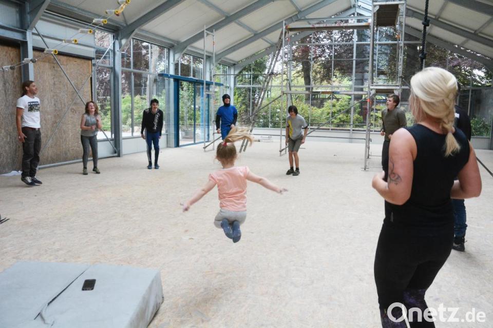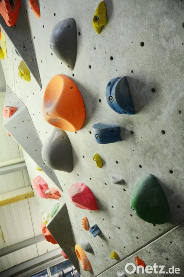Schon beim Aufwärmen ist die Gruppendynamik spürbar. Nacheinander macht einer der Jugendlichen eine Übung vor, alle anderen machen mit. Ohne Wiederrede, ohne Zwang. Hampelmänner, Unterarmstütz und Schulterkreisen. Dann geht es los. Bunte Griffe zeigen den Weg an. "Wer sich drei Sekunden am Zielgriff festhalten kann, hat es geschafft", erklärt Nico Erhardt vom Jugendzentrum. Als Belohnung gibt es ein High-Five.