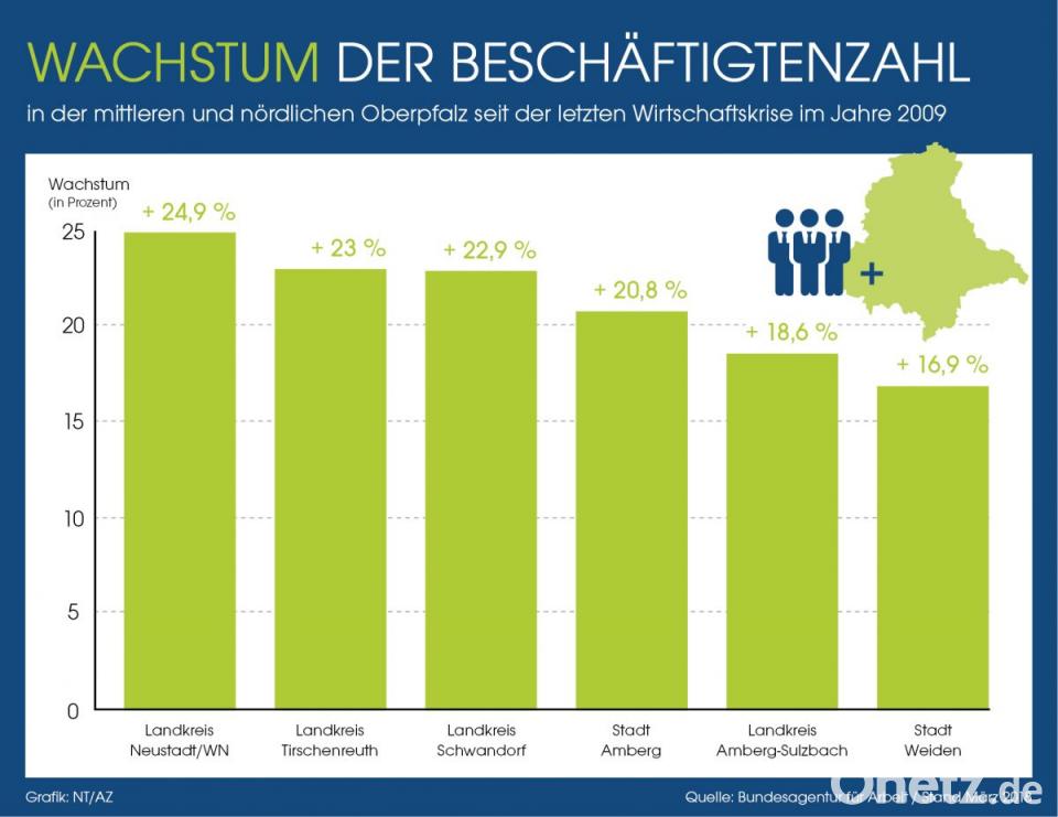 Die genauen Zahlen beweisen es: Seit dem Jahre 2009 ist die Beschäftigung im produzierenden und verarbeitenden Gewerbe einschließlich Handwerk um 38,7 Prozent angewachsen. Regionen, in denen diese Wirtschaftszweige vorherrschen, wie zum Beispiel die Landkreise Neustadt/WN, Tirschenreuth und Schwandorf, stehen deshalb an oberster Stelle. Die Stadt Weiden dagegen mit ihrem Beschäftigtenanteil im Dienstleistungssektor von fast 80 Prozent muss deswegen in einem von der Industriekonjunktur getragenen Aufschwung relativ zurückfallen.