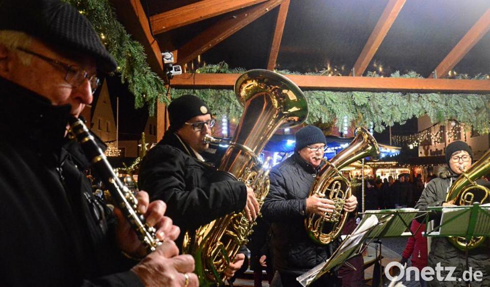 Während sich die Zuhörer die Finger an Glühweintassen oder Tüten voll gerösteter Mandeln wärmten, mussten die Brass-Band-Mitglieder kalte Tasten an ihren Trompeten, Klarinetten und Tuben drücken und „Leise rieselt der Schnee“ spielen. Von den kühlen Mundstücken ganz zu schweigen. Die Combo unter Leitung von Hubert Rupprecht ist fester Bestandteil des Weihnachtsmarkts. Präsentiert wurden vor großem Publikum am Sonntagabend beliebte, adventliche und vorweihnachtliche Lieder von „Morgen kommt der Weihnachtsmann“, "O Tannenbaum", "Kommet ihr Hirten" bis "Es ist ein Ros' entsprungen."