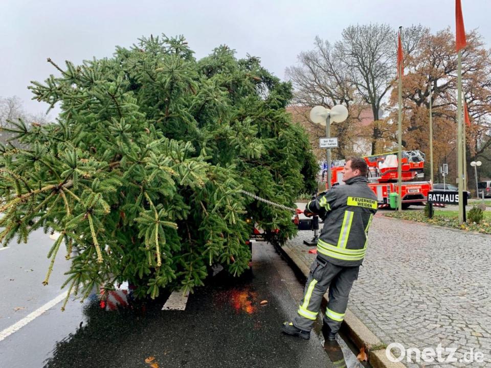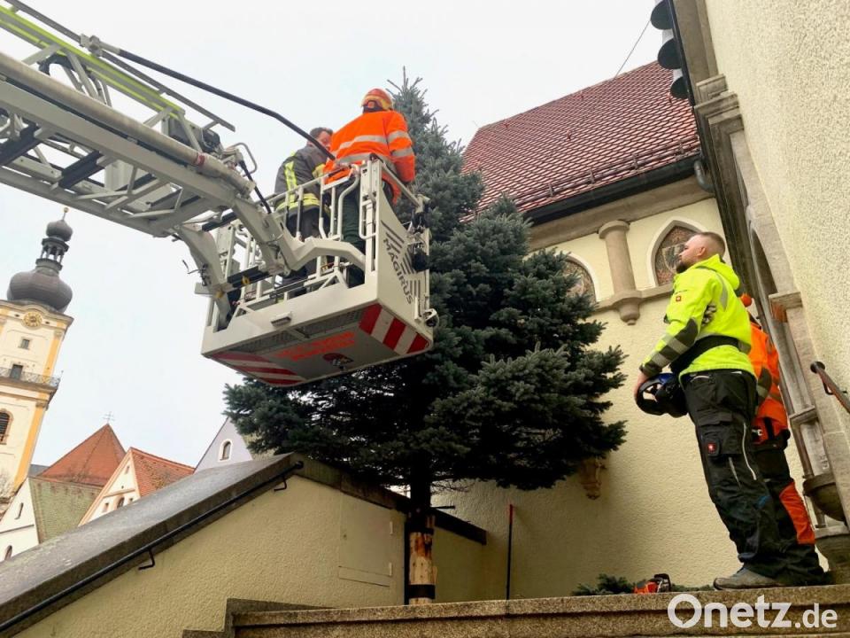 Auch der Christbaum vor dem Neuen Rathaus ist eine Spende aus einem Garten. Um die Fichte zu fällen und abtransportieren zu können, war gutes Organisationstalent gefragt. Laut Pressestelle der Stadt Weiden musste dies in einem Zeitfenster von 40 Minuten erfolgen, da in diesen Abständen immer ein Bus vorbeifährt.