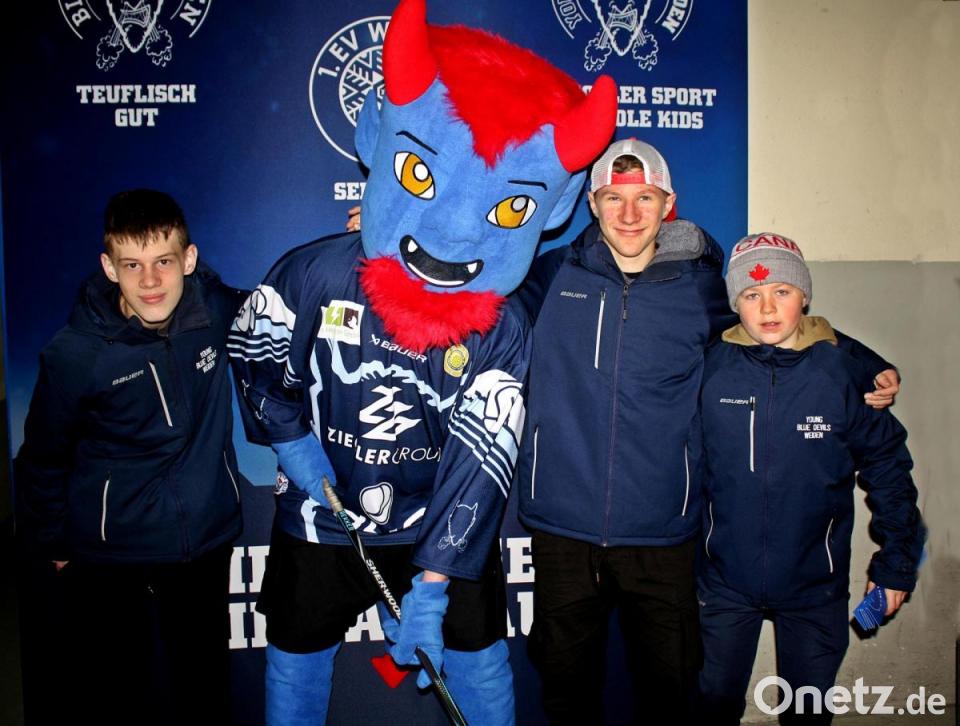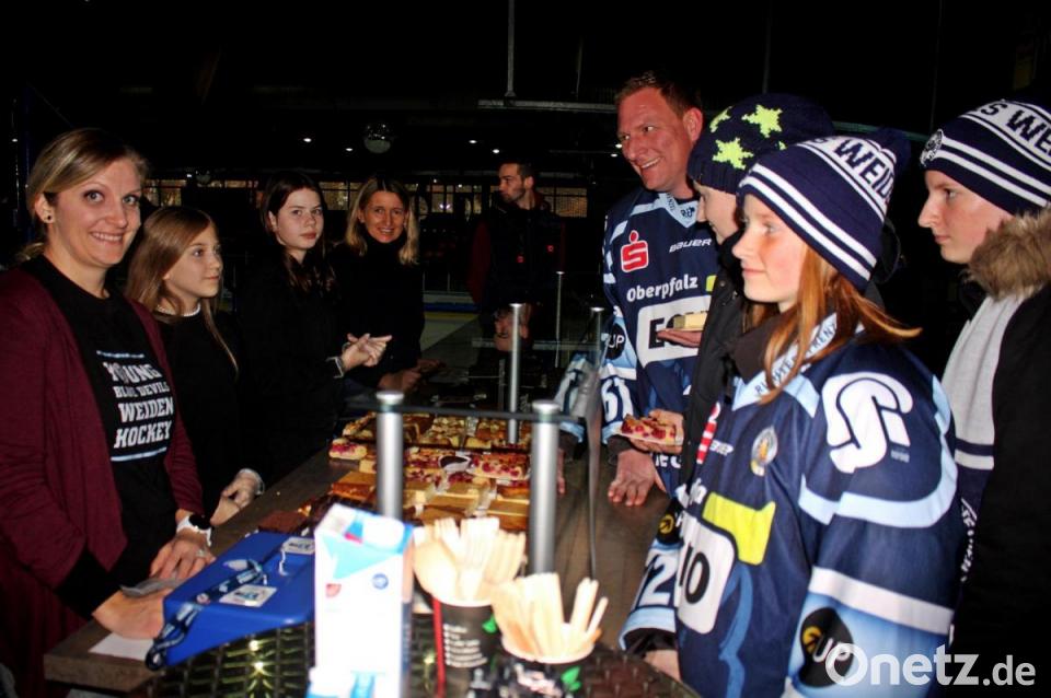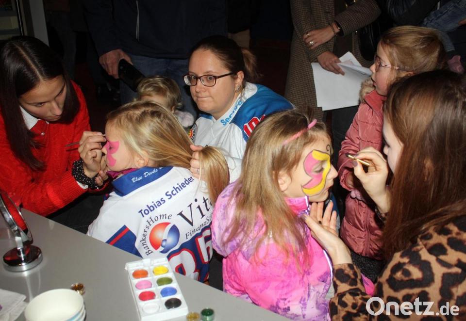 Bei den Blue Devils war der erste Advent gleichzeitig Familientag. Zwei Stunden vor Spielbeginn konnten sich in der Hans-Schöpf-Arena die Familien über ein buntes Programm freuen. Schon am Eingang war ein Tisch aufgebaut, an dem drei junge Damen die Jüngsten beim Kinderschminken überraschten. Da liefen dann Schmetterlinge, bunte Blütenkinder oder auch Teufelchen, in Anlehnung an den Vereinsnamen, durch die Eishalle. Die Eltern konnten sich am aufgestellten Stand mit Kaffee und Kuchen zu günstigen Preisen bedienen. Der Nachwuchs des Vereins bediente, reichte die Kuchen und Torten über die Theke. Der Erlös kommt den Young Blue Devils zugute.