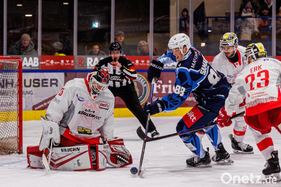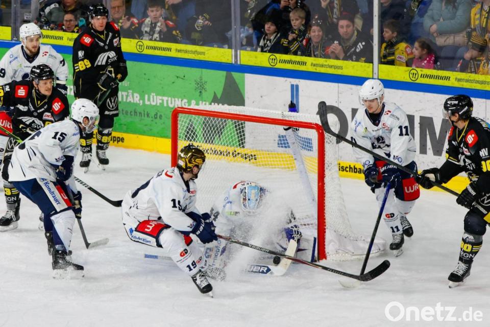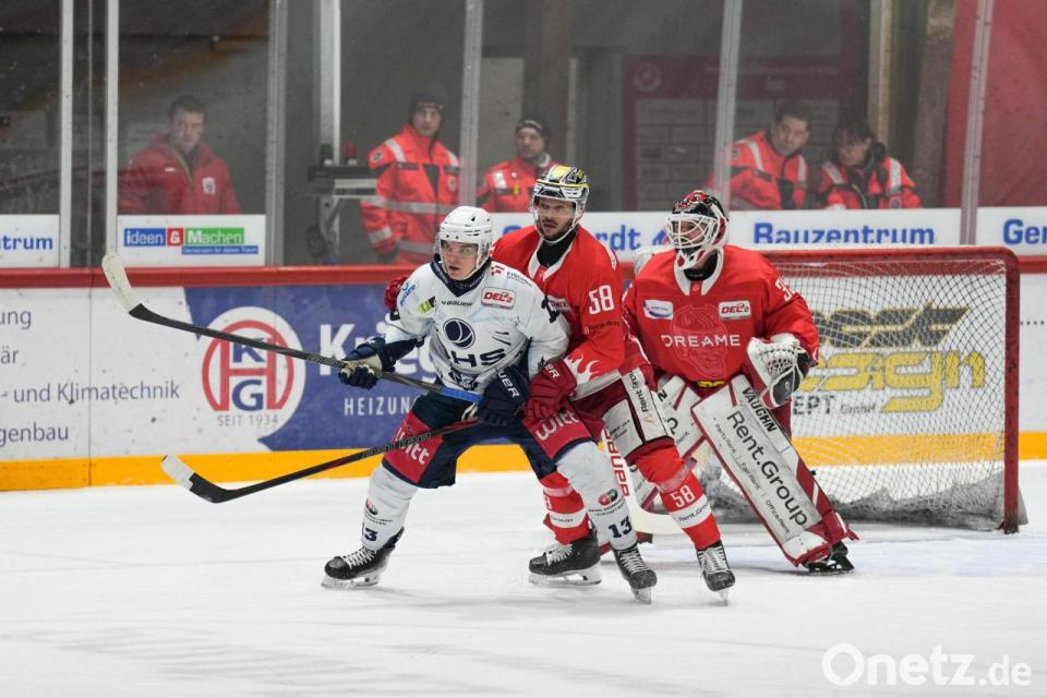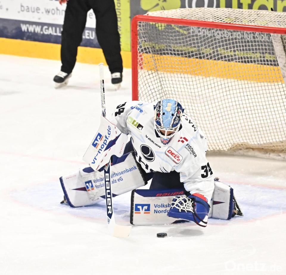 Torhüter Simon Wolf (links) hielt überragend, dennoch unterlagen die Blue Devils am Freitagabend in Ravensburg mit 2:3 nach Verlängerung.