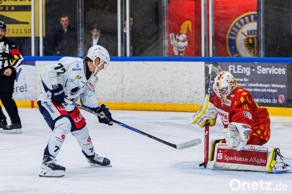 Weidens Georg Thal (links) trifft in dieser Szene zum zwischenzeitlichen 3:1 gegen seinen ehemaligen Teamkollegen Rihards Babulis vom ESV Kaufbeuren.