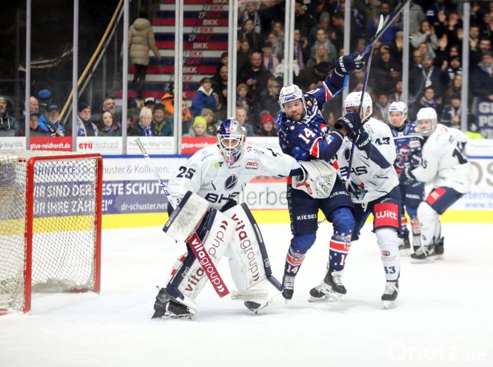 Der Weidener Noah Samanski (blaues Trikot) scheitert in dieser Aktion an Gerald Kuhn in Tor des EC Bad Nauheim.