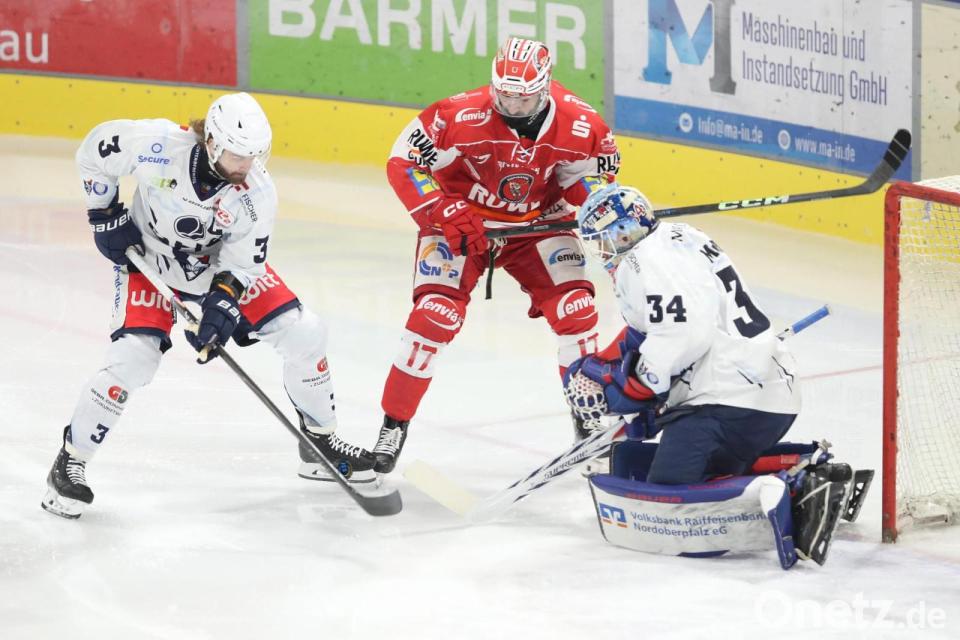 Weidens Kapitän Tommy Muck (links) und Goalie Michael McNiven (rechts) verteidigen gegen Ladislav Zikmund von den Eispiraten Crimmitschau. Die Weidener verloren das Auswärtsspiel am Sonntagabend mit 2:5.