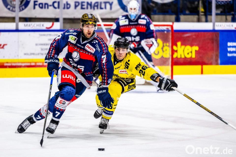 Ein Abend zum Vergessen für Kapitän Tomas Rubes (rechts) und die Blue Devils Weiden: Die Weidener verloren das Duell mit dem Aufsteiger Bietigheim Steelers am Freitagabend deutlich mit 1:6.