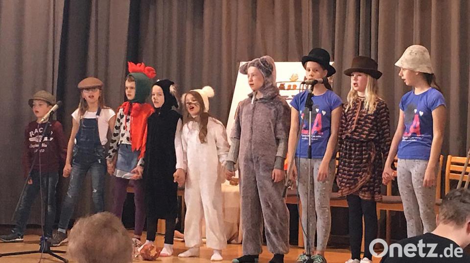 Die Kinder erzählten von vier grundverschiedenen Tieren, die schließlich Freunde werden und gemeinsam ihr Glück versuchen. Da ist der etwas alterstraurige, aber gar nicht dumme Esel (Veronika Reger), den der Müller (Leonie Jarczak) versuchte wegzuschaffen. Der Esel begegnet einem Jagdhund (Julia Uschold), den der Jäger (Thomas Uschold) totschlagen wollte. Das Kätzchen, das die beiden finden, erzählt jammernd, dass die Bäuerin (Lea Färber) sie ertränken wollte, weil sie lieber hinter dem Ofen sitzt, als Mäuse zu jagen. Sofia Soto brillierte hierbei mit ausdrucksvoller Stimme. Rania Fellner spielte einen eitlen Gockel, der mit aufgeregten Kopfbewegungen herumschritt. Er beklagte sich, dass die Magd (Sarah Jarczak) ihn in der Suppe essen wollte. Thomas Uschold, Sofie Pecher, Leonie und Sarah Jarczak und Julia Obwandner waren als Räuber und Lea Färber als Räuberhauptmann mit durchaus auch komödiantischen Zügen vergnüglich zu hören, ebenso der mutige und verletzte Räuber (Luisa Blenz).