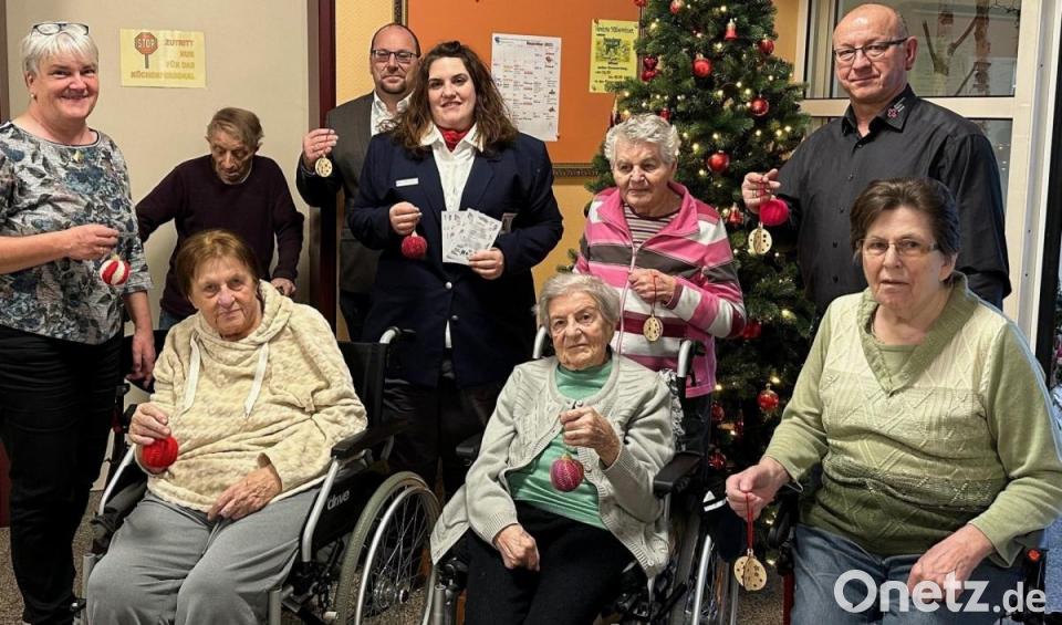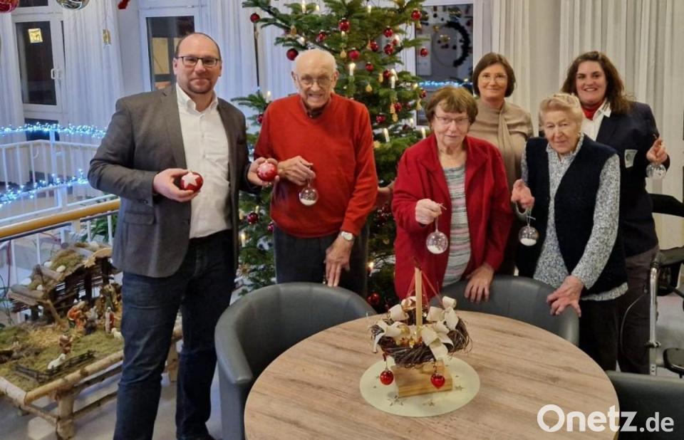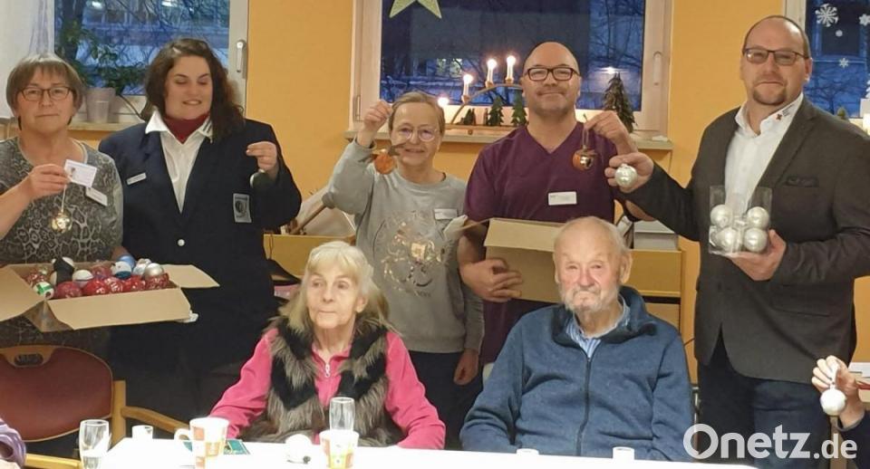 Die Leiterin der Jugendarbeit im BRK Kreisverband Weiden und Neustadt/WN, Stephanie Busch, bei der Übergabe der Weihnachtskugeln im Senioren Wohn- und Pflegeheim Erbendorf.
