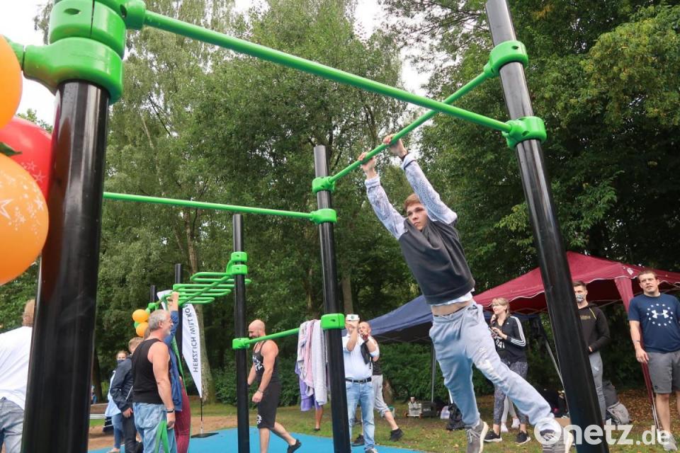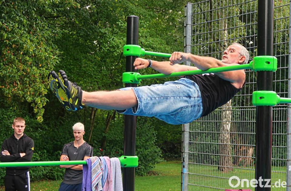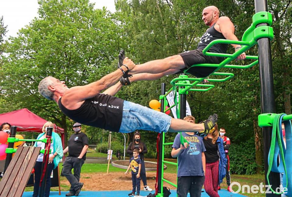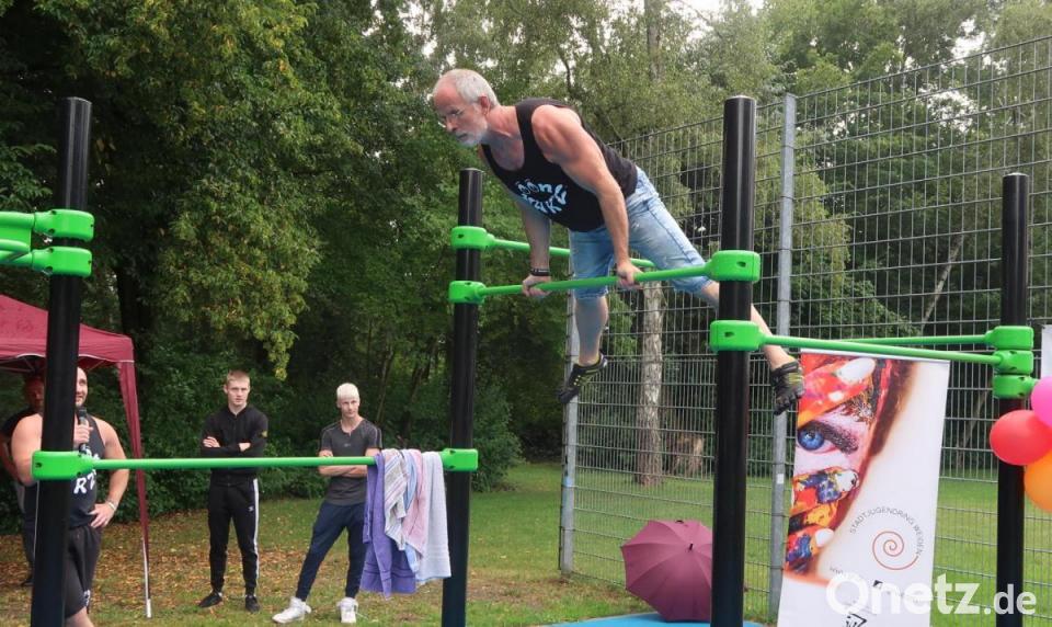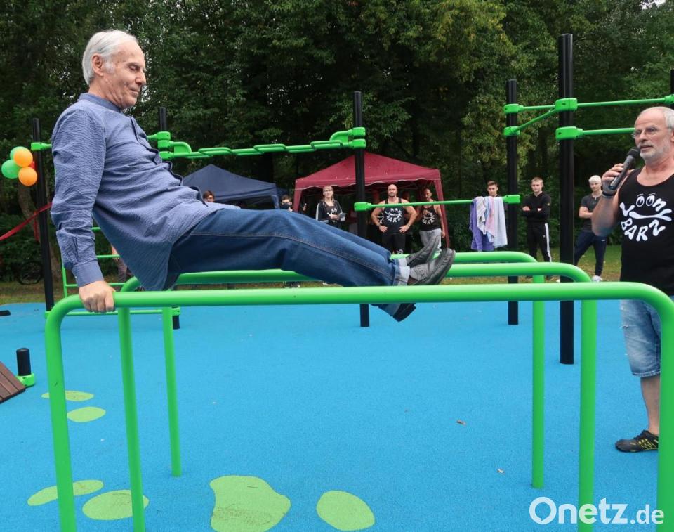 "In den 70er Jahren gab's den Trimm-Dich-Pfad. Heute heißt das Calisthenics." Diese Anlage sei natürlich viel moderner und attraktiver. Persönlich denke er aber mit Schrecken an seine eigene Schulzeit zurück, wenn er jetzt hier die angedeuteten Barren und Recks erblicke. "Mit diesen Geräten habe ich mir immer meine Sportnote versaut." Aber es gebe Menschen, die könnten sehr gut damit umgehen.