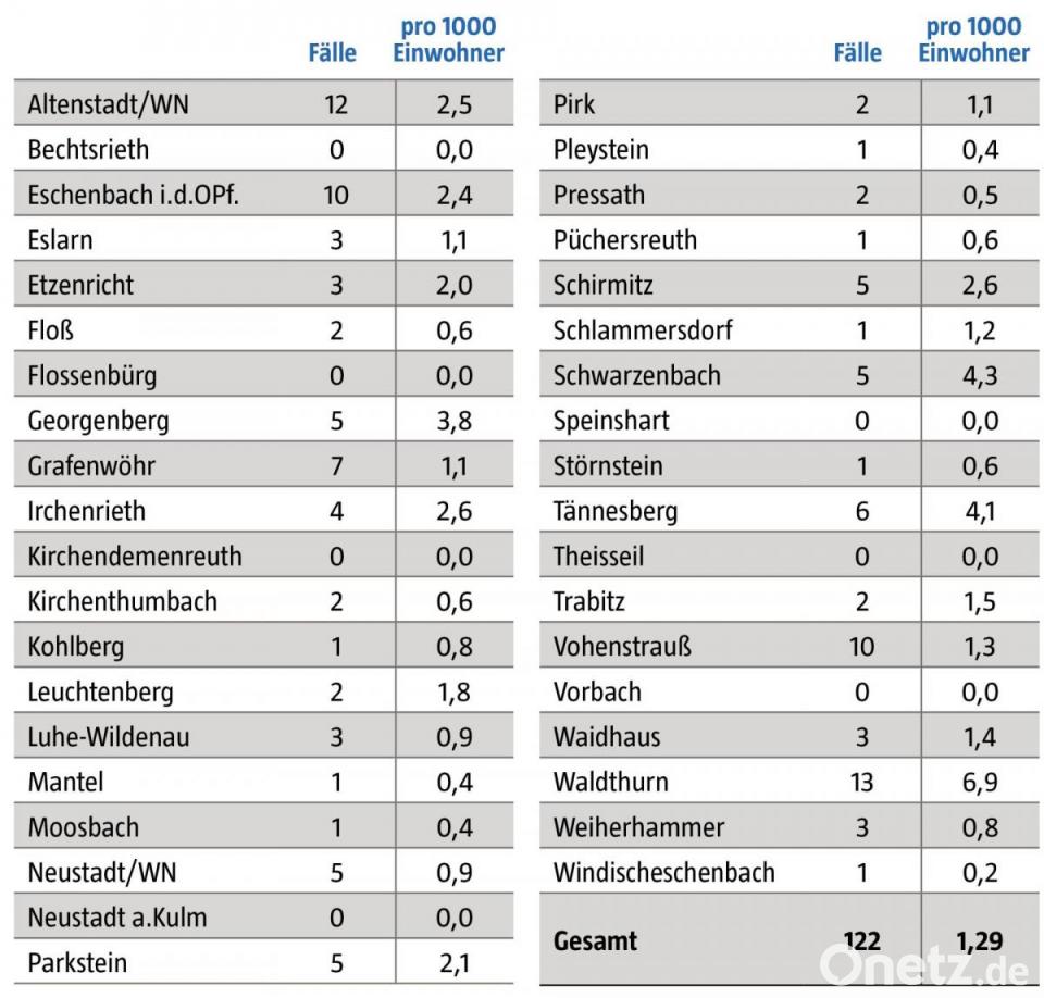 - Mit einer 7-Tage-Inzidenz von 6,9 pro 1000 Einwohner weist Waldthurn immer noch den höchsten Wert auf. 13 Menschen haben sich mit dem Coronavirus infiziert.
