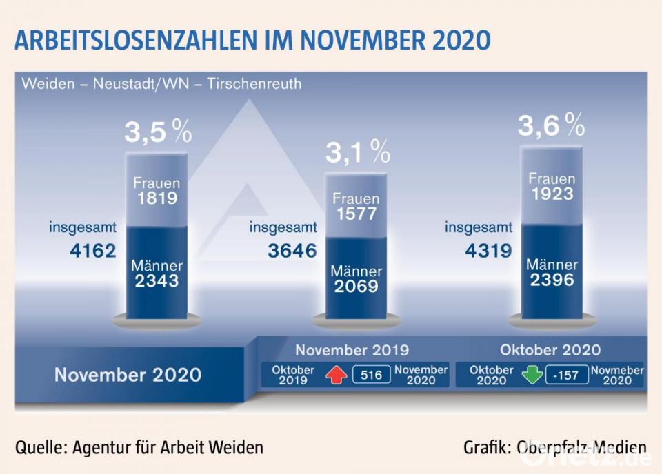Im November waren 2329 Personen im Bereich der Arbeitslosenversicherung gemeldet, 439 Menschen mehr als im Vorjahresmonat. Die Jobcenter Weiden-Neustadt und Tirschenreuth waren für 1833 arbeitslose Menschen zuständig. Binnen eines Monats waren 81 Arbeitslose weniger in Betreuung.