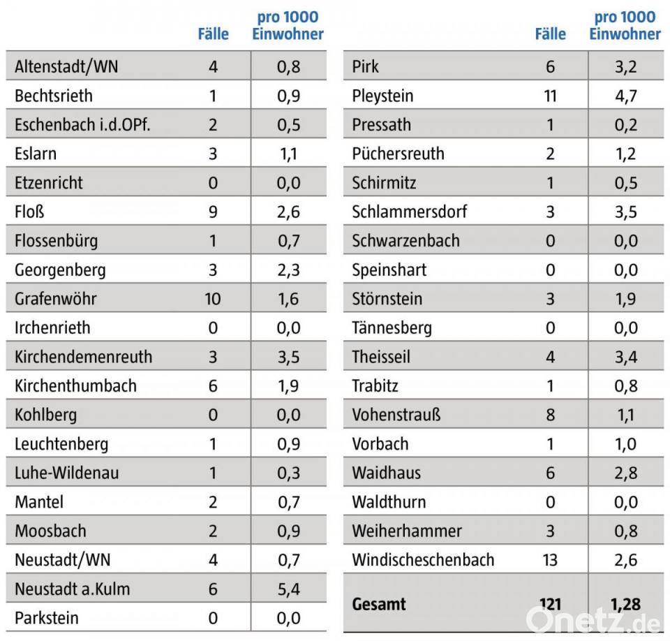 - Die meisten nachgewiesenen Neuinfektionen gab es im genannten Zeitraum in Windischeschenbach, Pleystein, Grafenwöhr, Floß und Vohenstrauß. Allerdings liegen diese Orte auch bei der Zahl der Einwohner recht weit oben im Vergleich zu den anderen Orten im Kreis, so dass eine hohe Zahl an Neuinfektionen allein nicht sehr aussagekräftig ist.