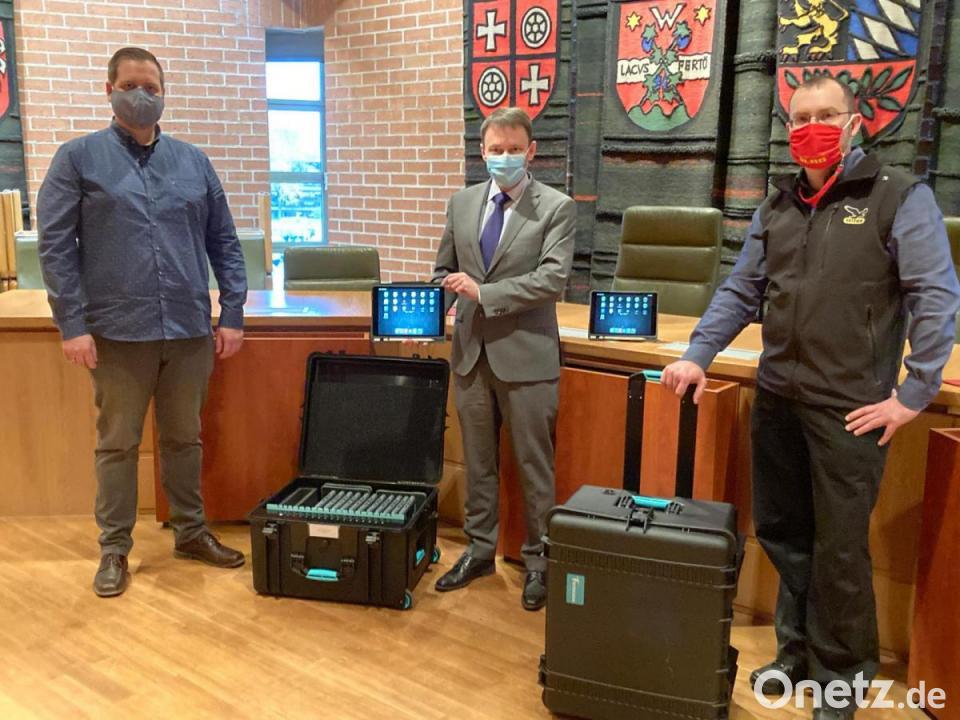Diese ersten 288 geförderten IT-Geräte, konkret I-Pads mit Ladekoffer, seien in den vergangenen Tagen bei der Stadt angekommen, wo sie zusammengesetzt und konfiguriert wurden, heißt es in einer Pressemitteilung. Oberbürgermeister Jens Meyer präsentiert zusammen mit dem Leiter der IT-Abteilung und einem Vertreter der Hauptverwaltungs- und Schulabteilung die Geräte auf einem Foto.