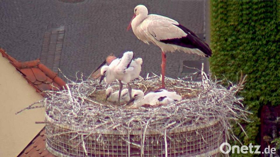 Und auch Storchenhorstbetreuerin Helga Bradatsch bestätigt, dass es sich um drei Jungvögel handelt. "Zwei sind schon rechte Lackl, Nummer drei ist deutlich kleiner." Bei ihm handle es sich wohl um einen Nachzügler. Allerdings habe er trotzdem eine Chance, wenn die Eltern ausreichend Futter fänden. "Kommt halt aufs Wetter an", weiß Bradatsch.