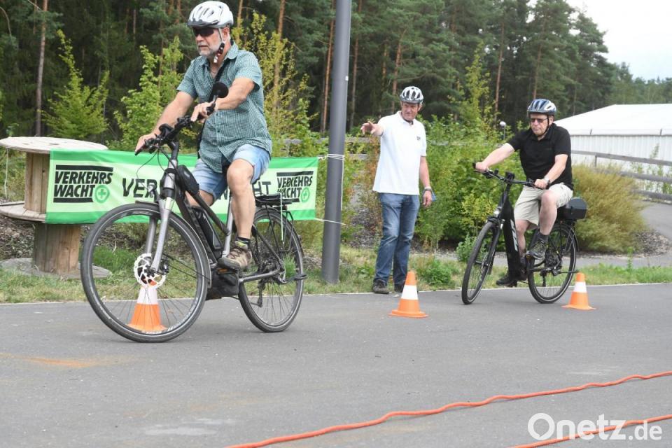 21 E-Biker mittleren Alters sind an diesem Freitagnachmittag zum Übungsgelände des Zweirad-Centers Weiden gekommen, um erste Grundkenntnisse für ihr neues, motorisiertes Gefährt zu erlernen. Ein Sicherheitsparcours wurde extra aufgebaut, an dem sich die Radler vorbeiwinden konnten.
