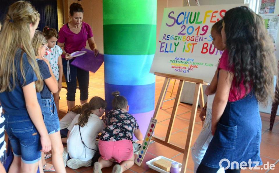 Beim Schnupperabend durften sich die Mädchen am unteren Teil der Säule verewigen. In Regenbogenfarben sind die einzelnen Jahrgangsstufen getrennt: unten die jüngsten, oben die Abiturklassen. Die restlichen Schülerinnen drücken ihre Daumen am Mittwoch beim Schulfest auf. Die Idee dazu hatte Kunstlehrerin Ramona Gilch. Zuvor wurden die neuen "Ellys" ihren Klassenkameradinnen und Klassenleitern vorgestellt.