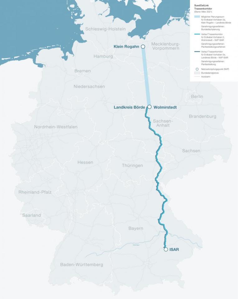 Ursprünglich war auch geplant, dass der SuedOst-Link lediglich Strom aus dem Norden von Wolmirstedt bei Magdeburg bis nach Isar bei Landshut leiten soll.
