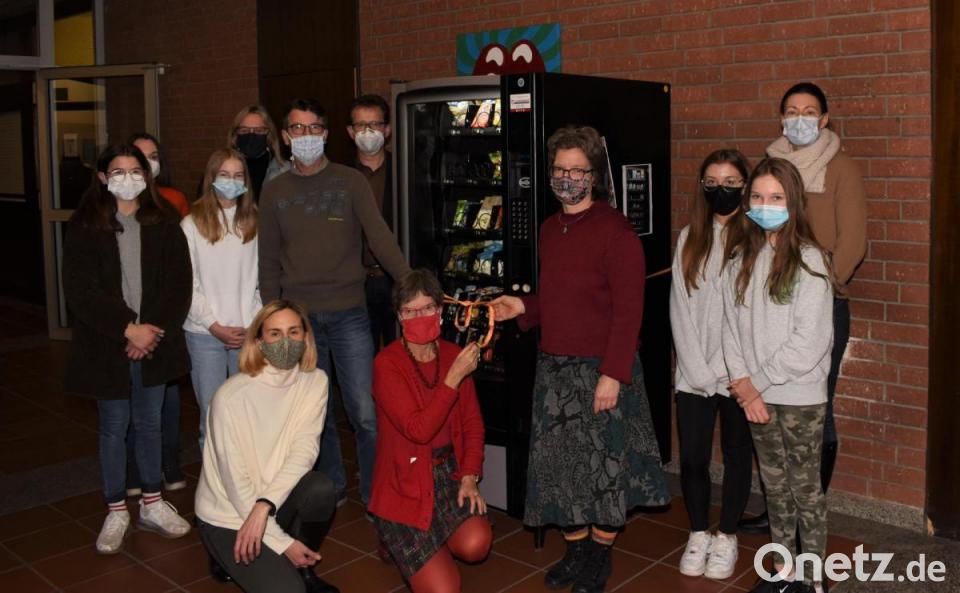 Anschließend öffneten Beddig-Jaeger, Rösel und Kneidl die Schleife, die den Automaten symbolisch für die Feier schmückte und gaben den Platz für die Schülerinnen frei.