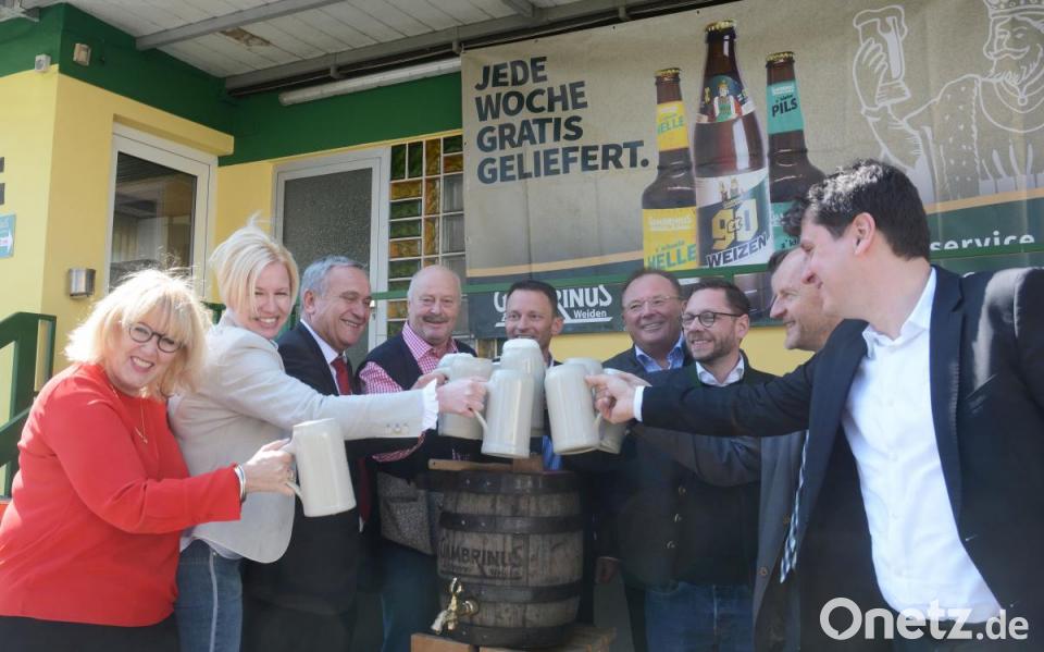 Noch ist Fasten- und damit Starkbierzeit, die erst mit dem Osterfest endet. Ein illustrer Kreis verköstigt am Gründonnerstag jedoch bereits das Gambrinus-Festbier, das den Gästen des Weidener Frühlingsfestes ab Freitag serviert wird. Gambrinus-Geschäftsführer Steffen Hartmann ist mit der Leistung seines Braumeisters Markus Andraschko ebenso zufrieden wie Festwirt Gerhard Böckl, der die bernsteinfarbene Spezialität in seinem Festzelt serviert wird. Der einzige Wermutstropfen: Die Mass wird mit 8.80 Euro diesmal um 40 Cent teurer.