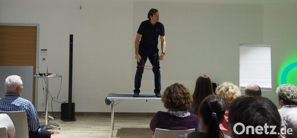 Erneut begeisterte Fitness-Trainer Thomas Eberl seine Besucher im voll besetzten Saal der Oberpfalz-Medien. „Topfit ins Jahr 2019“, lautete das Motto des mit Unterhaltungselementen gespickten Trainingsabends. Eberl spulte ein wahres Feuerwerk an Bewegungs-, Dehn- und Lockerungsübungen ab und sorgte auch immer wieder für viel Spaß. „Täglich einmal maximal fünf Minuten trainieren, nach dem Prinzip der minimalen Kontinuität“ reicht für Eberl aus, um schmerzfrei zu werden. „Ich stehe für intelligentes Training“, bekennt er und spricht von den „Klassikern Atmung und Bewegung“. Am besten solle man mit den Übungen am Morgen anfangen, gleich nach dem Zähneputzen und so ein tägliches Ritual entwickeln.
