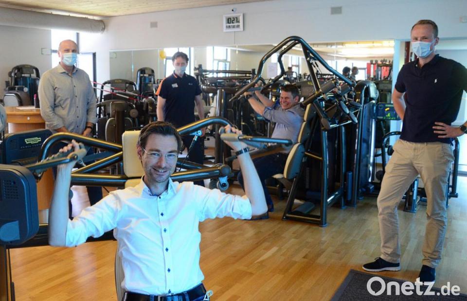 Wer das Studio an der Dr.-Seeling-Straße betritt, muss sich erst die Hände desinfizieren. Die Mund- und Nasenmaske muss solange getragen werden, bis sich der Kunde am Gerät niederlässt. „Arnold Schwarzenegger empfiehlt, die Masken sogar während des Trainings aufzulassen“, sagte Gerhard Paulus, der die Politiker gemeinsam mit Juniorchef Stefan Paulus durch das Studio führte. Mit Hilfe von Absperrbändern wird der Abstand zum nächsten Gerät ausgemessen. Unten im Tanzstudio wurden Quadrate über den Boden gezogen, innerhalb derer sich die Tanzschüler bewegen können.