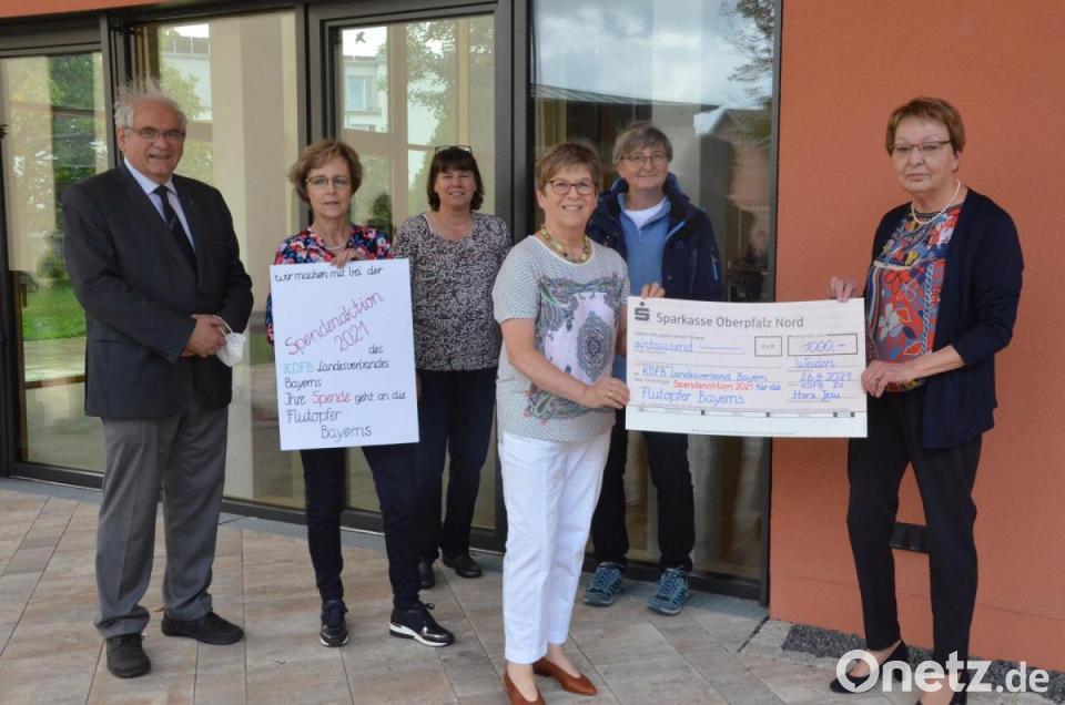 Der Frauenbund Herz Jesu überreichte am Donnerstag 1000 Euro für die „Flutopfer in Bayern“ an die Bezirksvorsitzende Margit Konze. Der Betrag werde umgehend an den Landesverband weitergeleitet, der zur Spendensammel-Aktion aufgerufen hatte. Wie Frauenbund-Vorsitzende Andrea Konz unterstrich, hatten die Frauen traditionell zu Mariä Himmelfahrt Kräuterbuschen gebunden und an die Kirchenbesucher verkauft. Dabei kam ein Verkaufserlös von 635 Euro zusammen. Die Summe wurde aufgestockt. „Ich spreche im Namen der Pfarrei Herz Jesu meinen Dank aus an den Frauenbund, der das Brauchtum aufrecht erhält“, sagte Stadtpfarrer Gerhard Pausch. Die Ausschüttung der Spenden erfolgt über die Diözesanverbände im Landesverband Bayern, in denen Flutopfer verzeichnet sind, die durch die diesjährige Hochwasserkatastrophe geschädigt wurden.