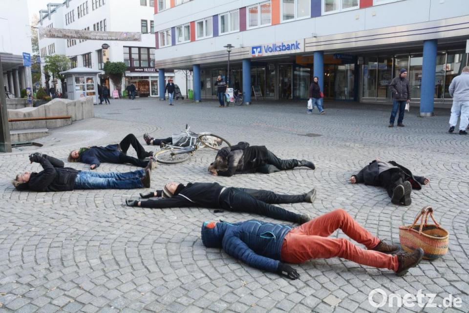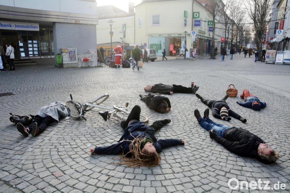 Ein Vergnügen ist es derzeit wohl nicht gerade, sich aufs kalte Pflaster zu legen. Da kann man sich ja den Tod holen? Eben! Auf die fatalen Folgen des Klimawandels wies nun schon zum zweiten Mal ein Flashmob der Weidener „Fridays for Future“-Gruppe hin: Auf Kommando sanken die sieben Aktivisten am Freitagnachmittag auf dem Macerata-Platz zu Boden und stellten sich für einige Zeit tot.