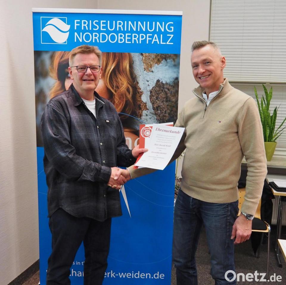 Außerdem wurde ihm für 25 Jahre Mitgliedschaft in der Friseur-Innung die Goldene Ehrennadel überreicht. Als amtierender Obermeister übergab Friseurmeister Alfons Kliebhahn die Ernennungsurkunde und die Ehrennadel. Kliebhahn würdigte die Verdienste des langjährigen Obermeisters. Seit dem Jahre 1997 sei Raml Vorstandsmitglied der Friseur-Innung gewesen. Auch habe er 15 Jahre lang als Mitglied des Gesellenprüfungsausschusses gearbeitet. Gratuliert hat dem neuen Ehrenobermeister auch die Geschäftsführerin des Landesinnungsverbands des bayrischen Friseurhandwerks Doris Ortlieb. Dabei lobte sie auch den „harmonischen Übergang vom bisherigen auf den neuen Obermeister“.