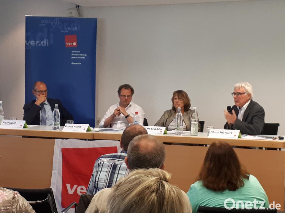 (exb) Pflegekräfte aus der Oberpfalz diskutierten mit Verdi über ihre Situation und dringende Verbesserungen. Podiumsteilnehmer waren Kati Petersen (SPD, Gesundheitsexpertin und Mitglied des Landtages), Josef Götz (Vorstand der Kliniken Nordoberpfalz AG) und Robert Hinke (Landesfachbereichsleiter Verdi Bayern). Zwei zentrale Entwicklung prägen ihrer Meinung nach die Krankenhauslandschaft: Die unzureichende personelle Ausstattung die roten Zahlen der Kliniken, so auch in der Region. 2016 waren in Bayern 42 Prozent der Krankenhäuser defizitär. Die Probleme sind nicht neu. Hinke verweist auf eine Befragung von Verdi aus dem Jahre 2014. Danach fehlen etwa 162 000 Stellen bundesweit, allein 70 000 in der Pflege und natürlich die zusätzlichen Finanzmittel für dieses Personal. Klaus Heyert, Verdi-Gewerkschaftssekretär, sagte, dass "immer öfter von gefährlicher Pflege in unseren Einrichtungen gesprochen wird".