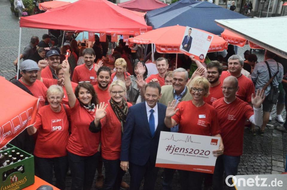 Dem war natürlich nicht so. Schon vor Meyers Eintreffen lief die Operation „Burger für Bürger“ der Genossen am Oberen Markt auf Hochtouren. Einen Euro für ein belegtes Brötchen: Preisgünstig. Klar, dass sich hier Schlangen bildeten. Dazu gab’s kräftige rockige Töne von der besagten Musikgruppe. Zeidler bat um Verständnis: „Musik und die Jugend gehört sich einfach ein bisschen zusammen.“