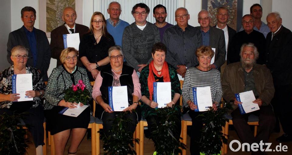 VdK-Vorsitzender Karl Stöckl ehrt mit einer Urkunde für 70 Jahre Mitgliedschaft Maria Moder, für 60 Jahre Herbert Kühner (sitzend rechts) und weiter für 30 Jahre Herbert Kroll, Wilhelm Weiss und Rita Bäumler. Ein Vierteljahrhundert sind Martina Teichmann, Peter Kleber, Silvia Sommer, Wolfgang Rother und Angela Baldauf im Verband. Magdalena Mühlbauer, Willibald Stade, Hans-Jürgen Beimler, Justin Kick, Irene Stöckl, Hedwig Eggmeier und Tobias Mattes wurden für 20 Jahre, Jürgen Kraus, Thomas Gleißner, Susi König, Waltraud Reichelt, Nicole Schäfer, Beate Schlecht, Guido Dittrich, Dieter Münchmeier, Hubert Forster, Edwin Hartwich, Helga Hartwich, Georg Baier, Christian Müller, Ramona Behr, Bernhard Ertl, Hildegard Sichert, Ingeborg Schönberger, Hans Spitzkopf, Franz Thanner, Rainer Cwienk, Karl Köstler, Manfred Kapsner, Ilona Ulbrich, Georg Wolfrath, Eduard Bayerl, Albert Weiß und Werner Neumann für 10 Jahre geehrt.