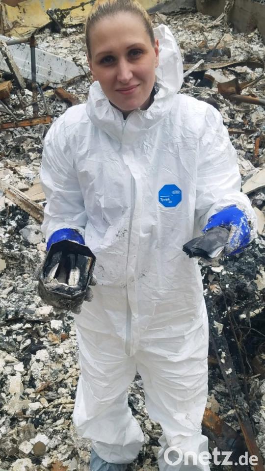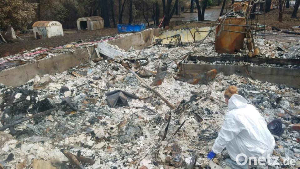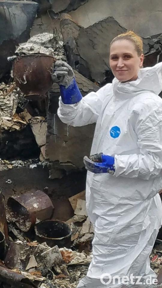 Kerstin Norten, gebürtige Weidenerin, steht in den Trümmern ihres bisherigen Wohnhauses in Paradise, Kalifornien. Den kleinen Ort hatte ein Feuer im November vollständig zerstört, darunter auch das Hab und Gut der 32-Jährigen und ihrer kleinen Familie.