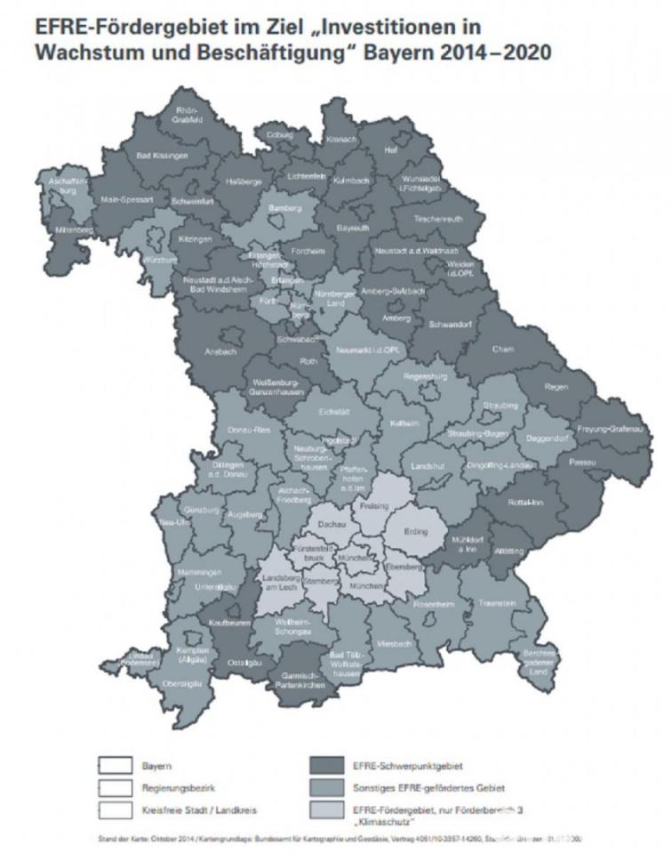 Die „sonstigen EFRE-Fördergebiete“ erhalten im Vergleich deutlich weniger Mittel. Im sogenannten Förderbereich 3 sind nur Projekte für den Klimaschutz förderfähig. In diese dritte Gruppe fällt derzeit in Bayern lediglich die Stadt München und deren direktes Umland.