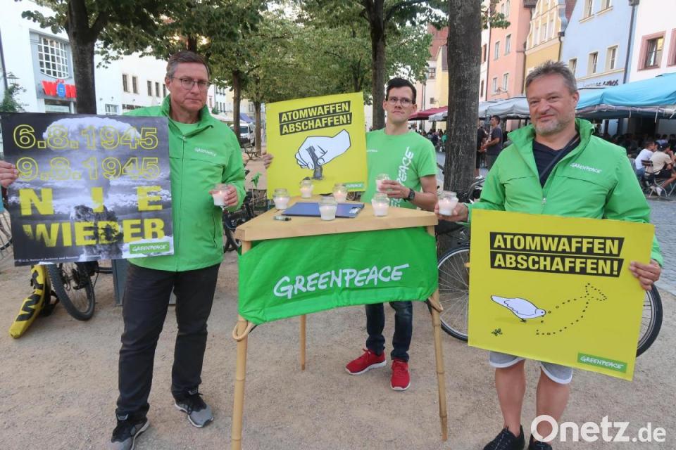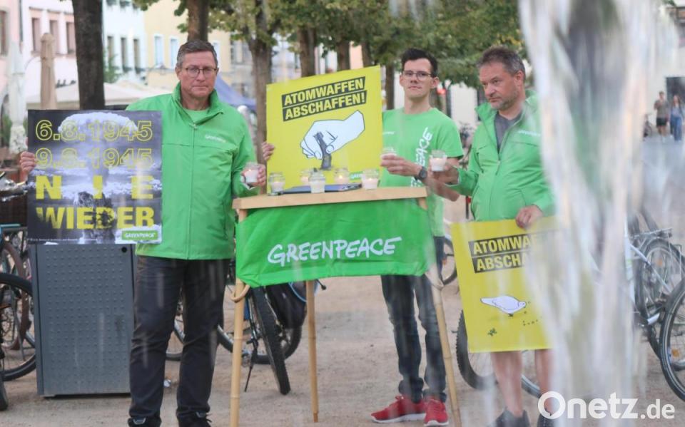 Deutschland soll Vorreiter werden für eine atomwaffenfreie Welt, indem die Bundesregierung den Atomwaffenverbotsvertrag unterzeichnet. Dafür setzt sich Greenpeace Weiden anlässlich des 77. Jahrestags des Atombombenabwurfs auf Hiroshima ein. In Gedenken an die Opfer von Hiroshima (6.8.1945) und Nagasaki (9.8.1945) versammelten sich vor dem Mauermann-Brunnen am Unteren Markt Ehrenamtliche mit Schildern und Kerzen zu einem stillen Protest.