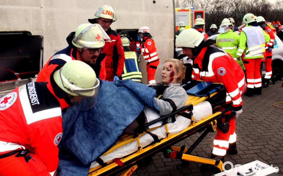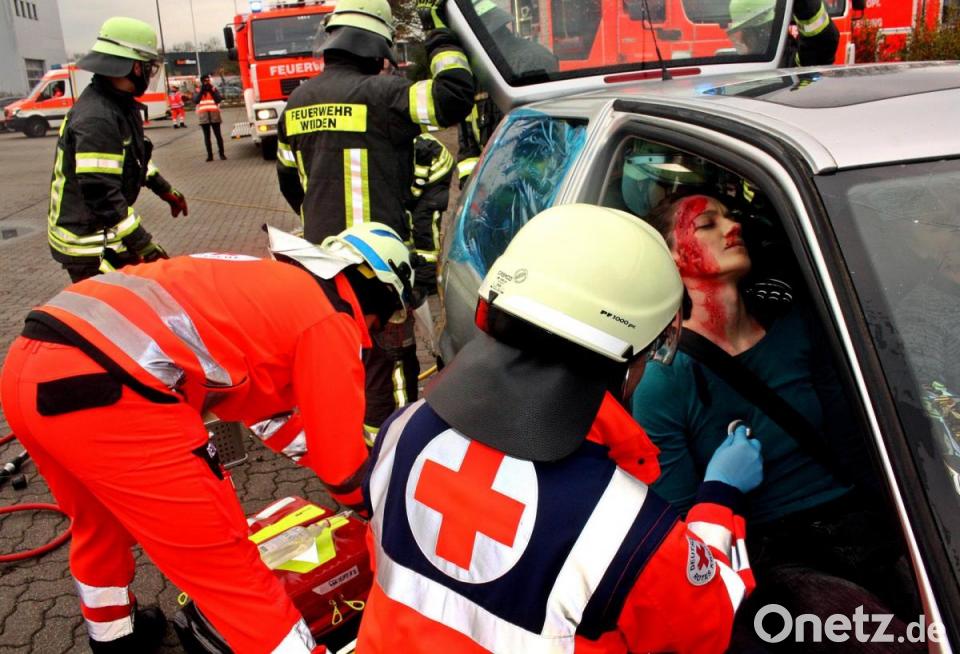 Während aus dem Bus Hilferufe tönen, ist im demolierten Auto kein Ton zu hören, beide Insassen sind schwer verletzt, die Beifahrerin sogar bewusstlos. Von der Stirn tropft Blut. Acht Rettungswagen mit Blaulicht sind deshalb bei der Übung nach Moosbürg unterwegs. Der Notarzt folgt, danach noch vier Krankentransportfahrzeuge, angefordert sind auch die Unterstützungsgruppe, Sanitätseinsatzleitung und die SEG Verpflegung Kirchenthumbach. Der Rüstzug der Feuerwehr mit Einsatzleiter Patrick Preßl mit genügend Fahrzeugen trifft bereits wenige Minuten später ein. Mit dem Spreitzer öffnet die Feuerwehr das Auto und entfernt beide Türen. Schon stehen die mobilen Fahrtragen und die Sitzstühle zur Verfügung. Beim Bus wird die Frontscheibe herausgetrennt und die Belüftungen aufgesägt. So können die Verletzten befreit werden.