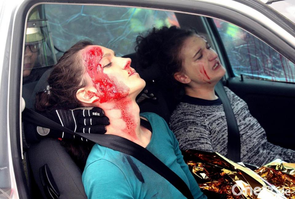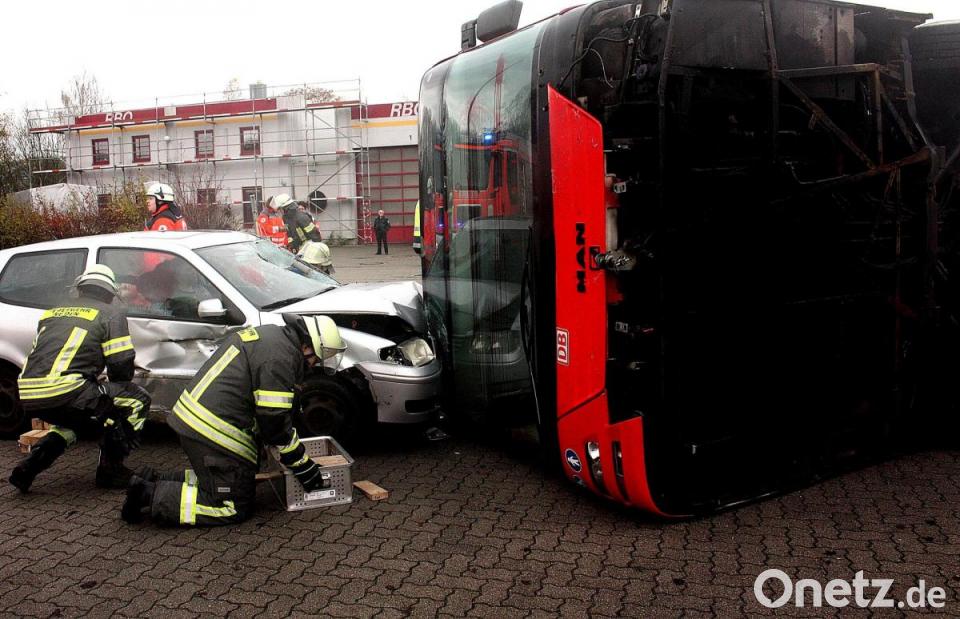 Die vielen Besucher erwartete ein furchtbares Szenario auf dem Gelände der Regionalbus Ostbayern GmbH: ein auf der Seite liegender Linienbus, in dessen Seite ein Auto steckt, das den Bus bei einem Frontalzusammenstoß zum Umkippen gebracht hatte.