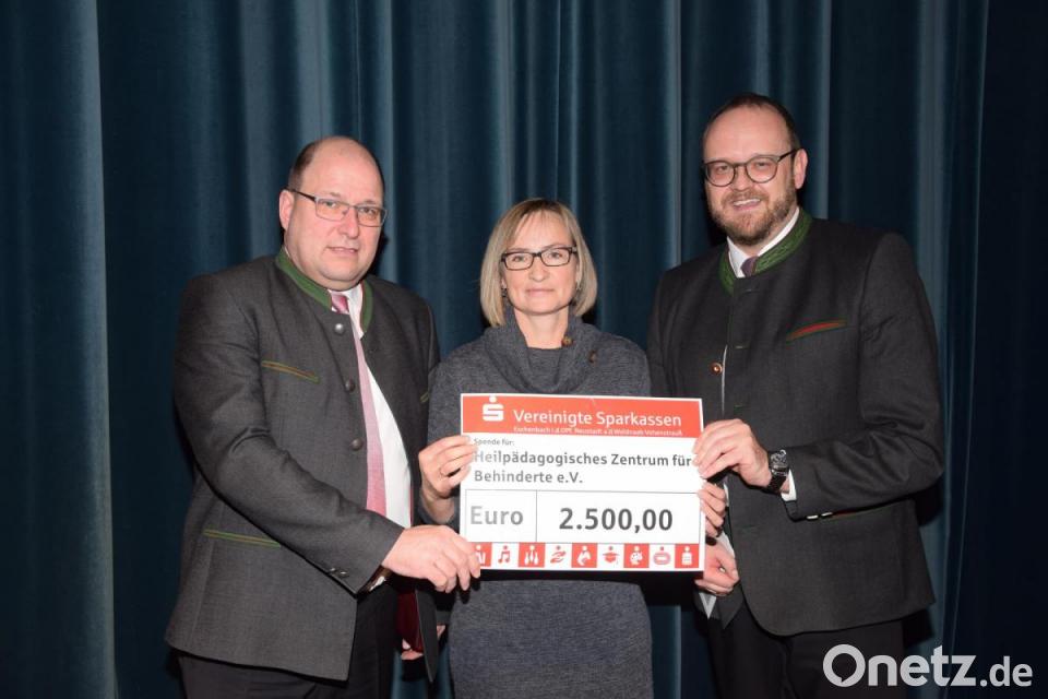 In der Weihnachtsansprache richtete die stellvertretende Aufsichtsratsvorsitzende Birgit Reil auch den Blick auf 2020 und sprach dabei die Zukunftsprojekte Förderschule, Wohnstätten und das Kinderprojekt an. Die Botschaft sei, dass das HPZ wächst und gedeiht. Dies und all das, was hier geboten werde, veranlasste Landrat Andreas Meier zu der Feststellung, dass sich der Landkreis Neustadt/WN glücklich schätze, eine solche Leuchtturm-Einrichtung zu haben. "Wir und alle Politiker hier im Raum wissen ihr Engagement für Menschen, die Hilfe brauchen, zu schätzen", hob der Landkreischef heraus und überreichte mit Johann Zach von den Vereinigten Sparkassen Eschenbach, Neustadt/WN und Vohenstrauß an Reil ein Weihnachtsgeschenk in Höhe von 2500 Euro.