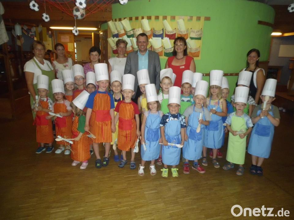 Auf der Speisekarte stand nach dem Begrüßungsdrink "Tropical" oder "Grenadine-Mix" ein leckeres und gesundes Abendessen mit Vollkornbrot und Kräuter-Dipp, Flammkuchen mit Schinken - Lauch oder vegetarisch mit Lauch - Tomate, Salat mit Kräuter-Dressing und als Dessert "Ameisen-Muffins" und "Zebra-Pudding". Alle Speisen wurden von den 114 Kindern zwischen mit ihren Erzieherinnen selbst zubereitet und an die Tische serviert. Mit der Starthilfe für "Ich-kann-kochen" der BARMER in Höhe von 500 Euro und Fördermittel aus dem Projekt "Kita-Einstieg/ frühe Hilfen" des Bundes in Höhe von 200 Euro konnten die Lebensmittel, aber auch die Ausstattung mit Küchengeräten, Schürzen und Kochmützen finanziert werden. Auch die Spender, Hans Kost von der Barmer-Regionalgeschäftsstelle Weiden, Alexandra Steinl-Kick von der gfi Weiden und die Fachaufsicht der Stadt Weiden, Beate Hoge, ließen sich das Menü schmecken.