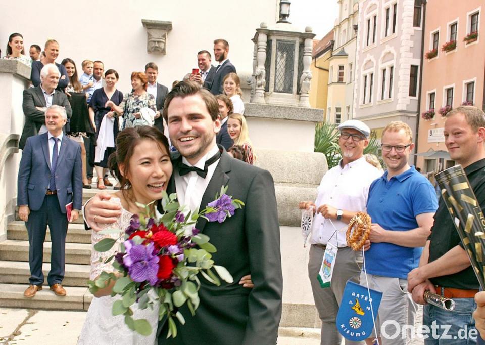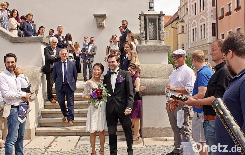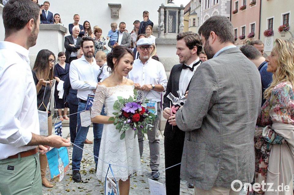 Auf den ersten gemeinsamen Schritten, stand erstmals die Verwandtschaft aus Singapur auf den Stufen des Alten Rathauses. Gratuliert hat der Round-Table Weiden mit dem Präsidenten Florian Dambeck, der aus dem Spalier heraus dem jung vermählten Brautpaar ein Stamperl „Ochsenblut“ serviertee. Nach der standesamtlichen Hochzeit gibt es die kirchliche Feier auf der Burg Falkenberg im kommenden Jahr. Bis dahin wird auch ein Ziel für die gemeinsame Hochzeitsreise feststehen.